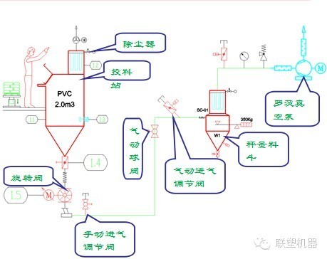 真空负压输送真空负压输送,采用罗茨真空泵对输送管路抽气,使投料站与秤量料斗之间产生负压差,形成气流,粉体与气流一同从投料站流向秤量料斗。