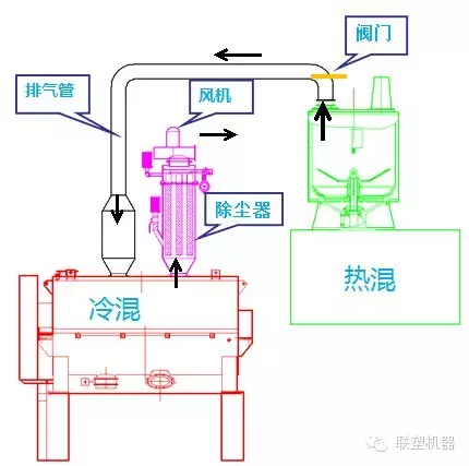 增加脉冲除尘装置及排气管热混混料的过程中,大量带粉尘的空气经排气管进入冷混,进入除尘器,经风机排出,此外,排气管还起到平衡热混,冷混腔体压力差的作用